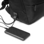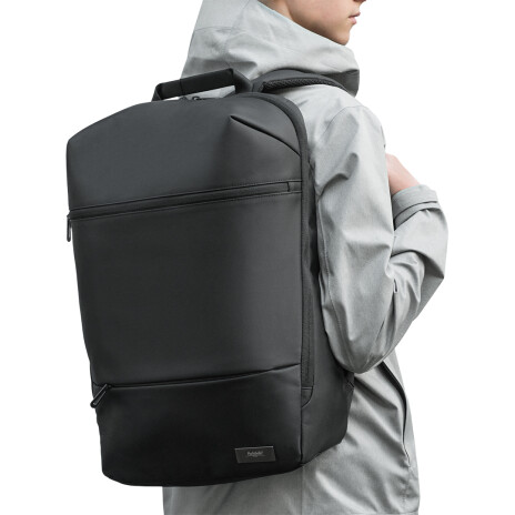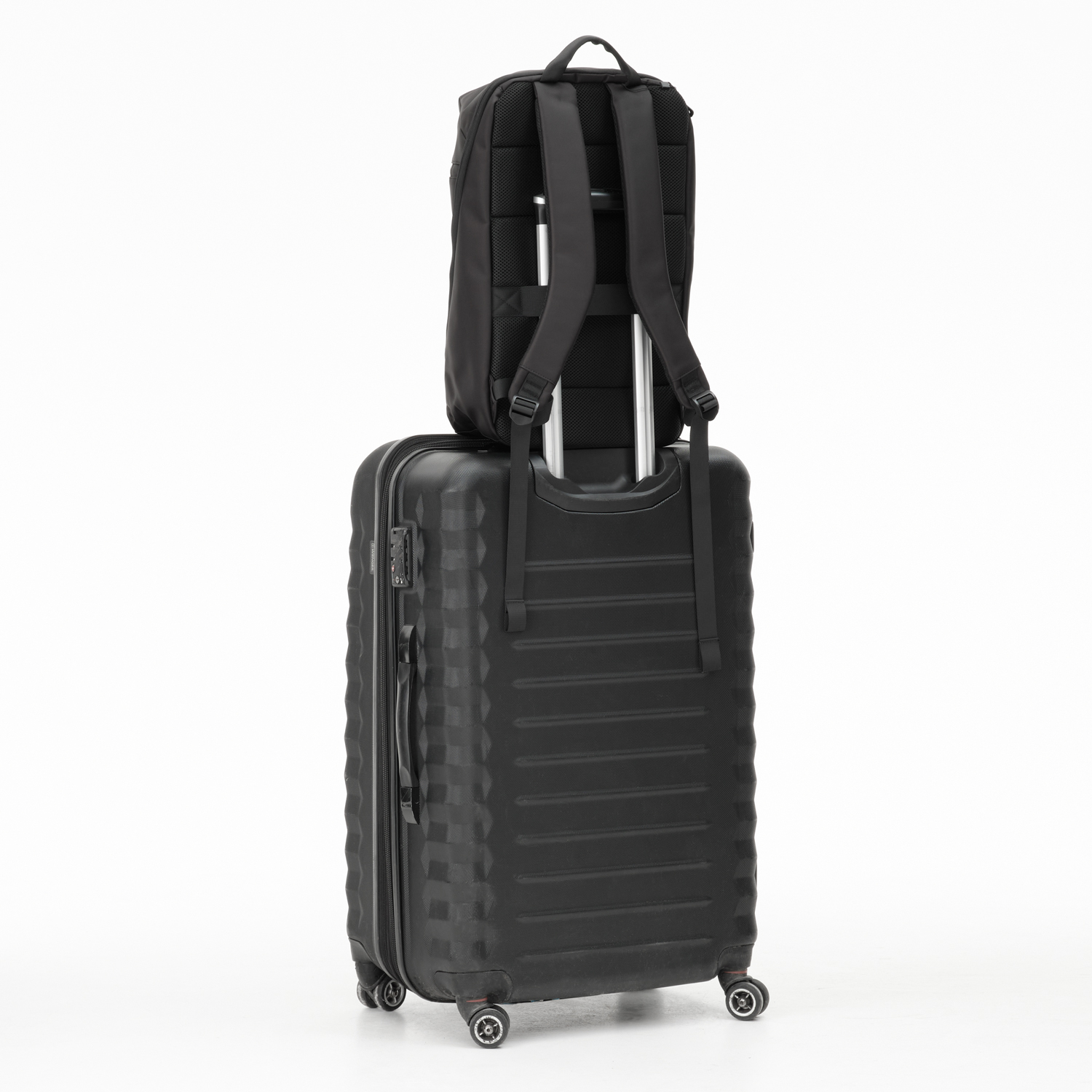 На спинке имеется багажная лента для закрепления рюкзака на ручке дорожной сумки. Сбоку разместился внешний порт USB с защитной крышкой для быстрой подзарядки гаджетов прямо на ходу. С лицевой стороны два кармана на молнии, один из которых выглядит как потайной.