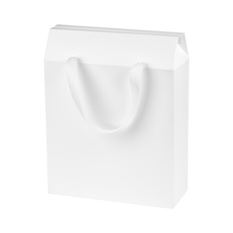 Универсальный пакет – коробка выполнен в белом цвете с ручками из рапсовой ленты. Вместительный и изящный, он станет хорошим решением упаковки подарка.