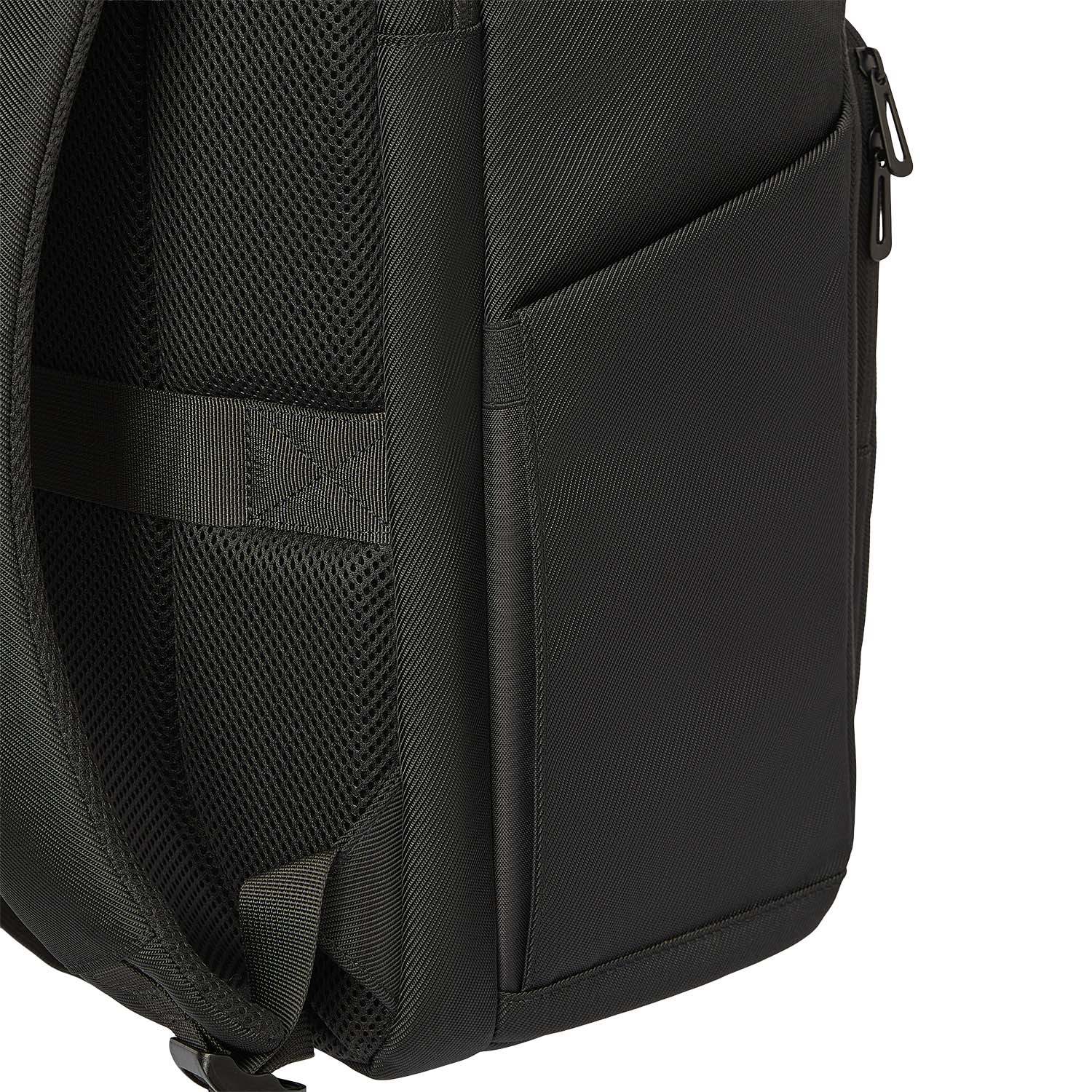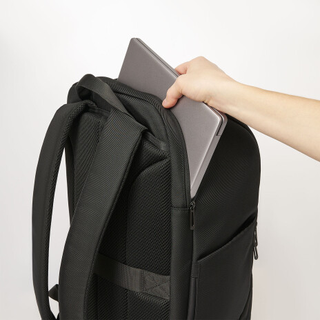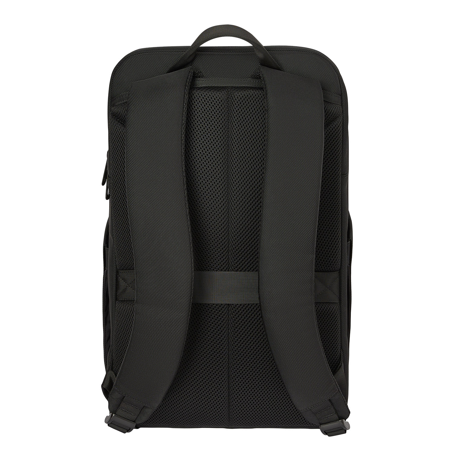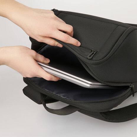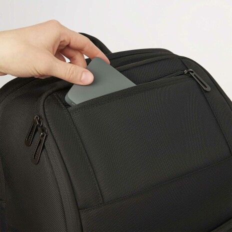 Уплотнённые стенки обеспечивают сохранение формы даже при неполной загрузке и лучшую защиту содержимого (гаджеты, хрупкие предметы). Основная секция раскрывается на 90°, есть отдельная секция для ноутбука. Рюкзак имеет две мягкие регулируемые лямки, два боковых кармана с фиксаторами и багажную ленту на спинке.