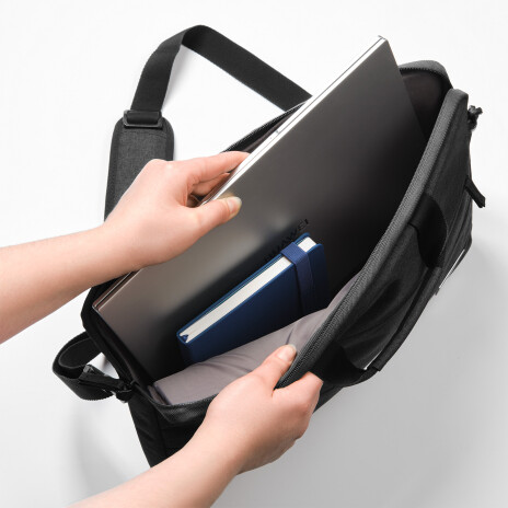 Основное отделение для ноутбука с диагональю до 15,6 дюймов оснащено мягкими вставками для защиты при транспортировке. В комплекте удобный регулируемый плечевой ремень. Крепкие ручки и съемный плечевой ремень обеспечивают комфорт при носке.