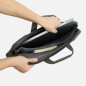 С внешней внутренней стороны общее отделение на липучке, которое можно использовать как дополнительное отделение для бумаг, либо открыть молнию внизу и одевать на выдвижную ручку вашего чемодана.