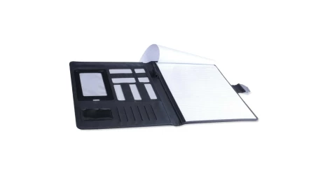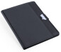 Функциональная папка А4 из полиэстера в сочетании с мягким кожзамом Оригинальная металлическая застежка Внутри есть отсеки для хранения флешки, внешнего аккумулятора, смартфона с доступом к его сенсорному экрану, отделения для карт и пенхолдер Сменный блокнот с 20 нелинованными белыми листами Черная картонная упаковка - имеет небольшие потертости