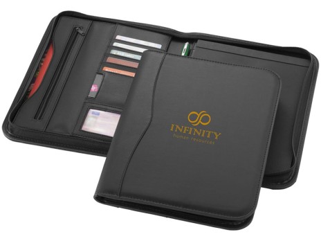 Папка с застежкой-молнией, держателем для пучки, карманом на молнии, отделениями для документов и блокнотом А4 с 20 страницами линованной бумаги. Ручка и принадлежности не включены.