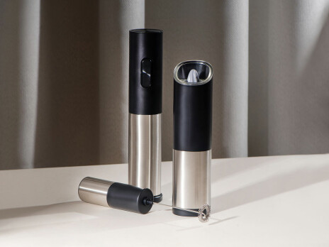 Электрический штопор «RIOJA» бренда Master of Wine — прекрасный подарок любителю вина: эта модель поставляется в элегантной упаковке в комплекте с подставкой, которая также может выступать в роли ножа для фольги. Благодаря устойчивой и функциональной подставке штопор всегда будет под рукой, а внешний вид «Rioja» станет настоящим украшением барной стойки или кухни. Верхняя часть корпуса выполнена из матового пластика, который легко очищается от загрязнений влажной тканью. Тактильно приятный текстурный материал для удобства использования. Кнопки спуска и поднятия штопора визуально выглядят как одна большая кнопка, при нажатии на нижнюю часть которой спираль вкручивается в пробку по часовой стрелке, а при нажатии на верхнюю — освобождает пробку, вращаясь в противоположном направлении. От пользователя требуется лишь правильно расположить штопор на пробке и нажать на кнопку. Модель работает от 4 батареек АА, не имеет внутреннего аккумулятора. Батарейки не прилагаются в комплекте. - подставка с функцией ножа для фольги в комплекте - легко откупоривает вино - эргономичное строение: спираль полностью спрятана в корпусе, что обеспечивает долгий срок службы и защищает от порезов по неосторожности - дизайн продолжает общий стиль Master of Wine, можно сочетать с другими товарами бренда для создания сета - украсит собой любую кухню, благодаря подставке можно разместить удобным образом - понятная инструкция на русском языке в комплекте «Rioja» предназначен для пробок диаметром 20-24 мм и высотой до 44 мм. Внешний диаметр горлышка бутылок не должен превышать 35 мм, внутренний — быть в диапазоне от 17,5 до 23 мм.