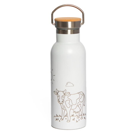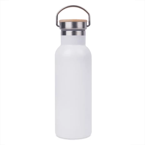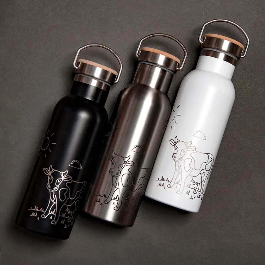 Бутылка для воды с двойными стенками из нержавеющей стали.Держатель на крышке для удобства переноски.Верхняя часть крышки из бамбука, отлично подходит для персонализации