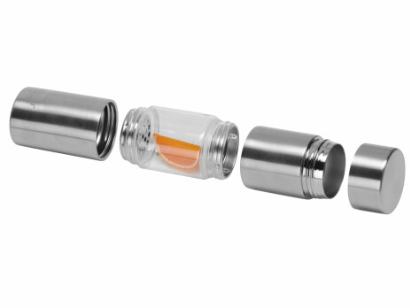 Бутылка для воды «FLAVOUR U SEE» от Asobu с прозрачным окошком посередине не только поможет вам приготовить питательную и вкусную фруктовую или ягодную воду, но и сделает ваш день немного ярче, позволив насладиться видом фруктов, а также дополнит ваш образ в качестве аксессуара. С обеих сторон прозрачной емкости, куда вы можете поместить дольки, размещены ситечки с крупными ячейками, которые не препятствуют свободной циркуляции воды и одновременно не пропускают плоды в основное отделение, где они могли бы мешать питью. Бутылка выполнена из полностью безопасных для человека материалов: тритана и нержавеющей пищевой стали марки 18/8, которой не страшны коррозия и ржавчина. Металлические сегменты бутылки имеют двойные стенки с вакуумной изоляцией. Из-за особенностей конструкции мыть бутылку можно только вручную. Рекомендуется использовать для холодных и теплых напитков температурой до 60 градусов Цельсия. • безопасные для человека материалы • герметичная: содержимое вашей сумки в полной безопасности • сегмент под фруктовую или ягодную воду • легко моется, легко разбирается • ситечки защищают основное отделение от кусочков фруктов • удобный объем 460 мл