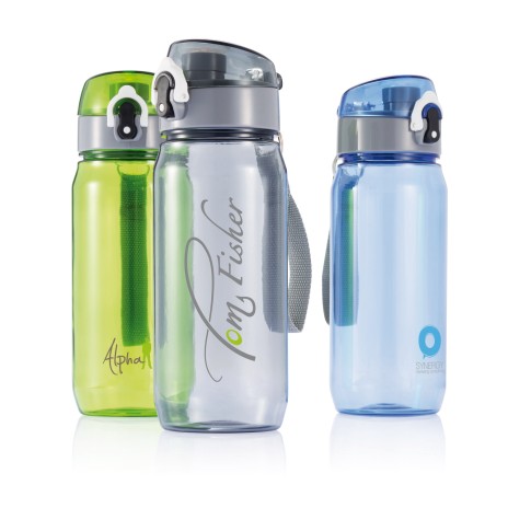 Бутылка для воды Tritan объемом 600 мл. Прозрачная бутылка из экологичного материала, который не впитывает запахи и не содержит бисфенол. У бутылки удобная крышка, которая открывается нажатием на кнопку, есть фиксатор, который не позволит бутылке случайно открыться во время движения. В комплект входит ремешок для запястья.