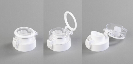 Удобная система открытия, не нужно ничего крутить, достаточно нажать кнопку. Угол открытия крышки более 180º, так она не мешает при питье.
