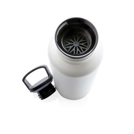 Герметичная вакуумная бутылка с двойными стенками, изготовленная из нержавеющей стали с порошковым покрытием. Крышка 2-в-1 с фильтром, отлично подходящим для горячего чая или воды с добавками. Стандартное горлышко идеально для неспешного потягивания вашего напитка или добавления кубиков льда. Бутылка рассчитана на долгий срок службы, пригодится вам в любое время года. Внутренний слой из стали марки 304 и внешний марки 201 сохраняет ваши напитки горячими до 5 часов и холодными до 15 часов. Объем: 600 мл.