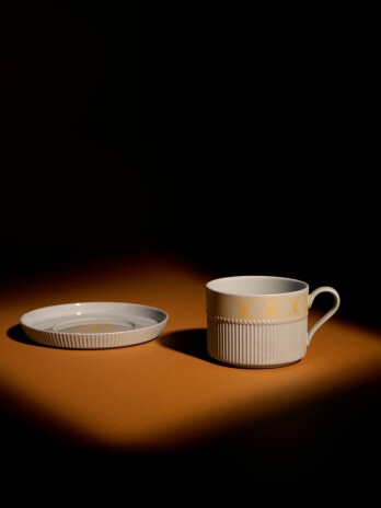 Орнамент корпуса кружки и высокого бортика блюдца напоминает изящные каннелюры — вертикальные желобки на колонне. Это добавляет всему изделию изысканности и стилистической завершенности, благородства и античной строгости.