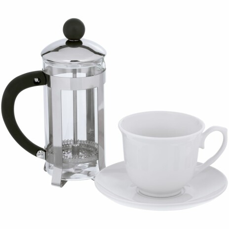 - Размеры: чашка: диаметр 9,2 см, высота 7,5 см; блюдце: 14,5x2 см; френч-пресс: высота 19 см, диаметр 7 см, ширина с ручкой 11,5 см, упаковка 19х12х8,5 см; пакет: 23х35х10 см