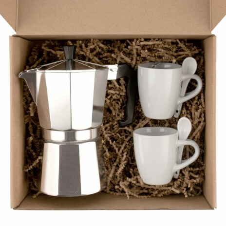 - Размеры: кружка: диаметр 5,8 см, высота 6,9 см; ложка: 8,5x2 см; кофеварка: высота 19 см, диаметр 10 см, ширина с ручкой 17 см; коробка 25,3х21,2х11,4 см