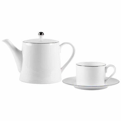 Аристократичная модель чайной посуды от собственной торговой марки BRISTOL. Чайный набор состоит из чайника и чайной пары, декорированы серебряным кантом. Все предметы изготовлены из костяного фарфора. Это разновидность материала, в котором, помимо основных компонентов, содержится примесь обожженной костяной муки. Такая посуда обладает тонкими стенками и значительно легче, чем аналогичные модели, но не уступает им по прочности. Весь набор отличается элегантной фактурой и идеально белым цветом. Чайник имеет цилиндрическую форму и объем 900мл. Чашка плотно прилегает к блюдцу. Ее объем 200мл. Этот набор станет элегантным подарком, который придаст особый шарм традиционному чаепитию. Поставляется в подарочной коробке с ложементом.Размер коробки: 26х26х15,5см*Внимание! Не рекомендуется мыть в посудомоечной машине.Кант гарантированно устойчив к ручном мытью в течении полугода.