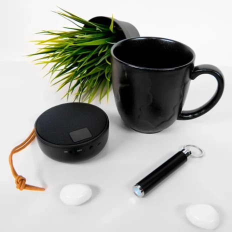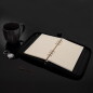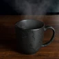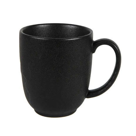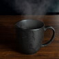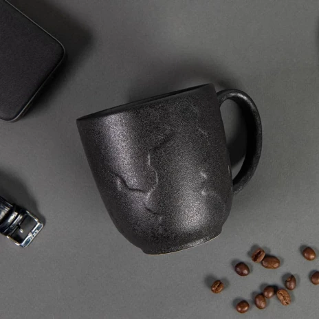 Кружка большого размера с удобной ручкой. Наружная и внутренняя части черного цвета. С одной стороны, покрытие напоминает чугун и выстраивает ассоциативный ряд со старинными решетками, дверьми и ключами от них.