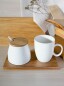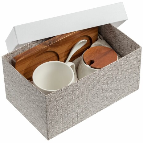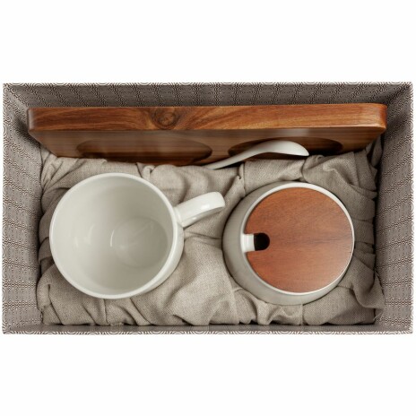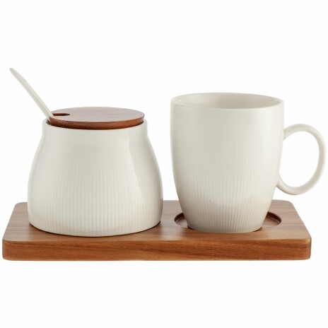- Размеры: сахарница: диаметр 9,8 см, высота 8,5 см; кружка: диаметр 8,2 см, высота 9,5 см; ложка 13 см; поднос 22х12 см; упаковка 24,8x15,5x12,3 см
