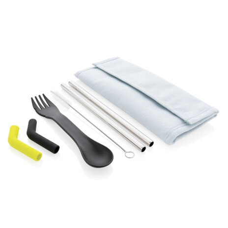 Набор столовых приборов Tierra — идеальный спутник для тех, кто хочет сократить использование одноразового пластика. В него входят 2 соломинки из нержавеющей стали, ершик для мытья, ложка-вилка и 2 силиконовые насадки на трубочки для более комфортного питья. Благодаря разным цветам насадок вы легко отличите их друг от друга. Приборы поставляются в удобном чехле для хранения, который надежно закрывается на липучку. Совместим с посудомоечной машиной. Чехол снаружи — полиэстер 600D, внутри — 100% полиэстер 210D. Не содержит ПВХ.