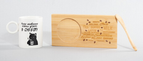 Набор состоит из фарфоровой кружки объёмом 230 мл, подставки и ложки из натурального бамбука. Комплект можно использовать в тематических сетах, эко-подборках и, конечно, как самостоятельный подарок.Поставляется в лаконичной крафт-коробке.