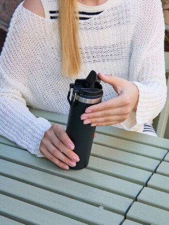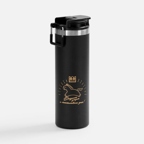 Лаконичный дизайн с ровным цилиндрическим корпусом — специально для круговой печати и гравировки, достаточный объем и привлекательная деталь в виде подвижной квадратной ручки для переноски.