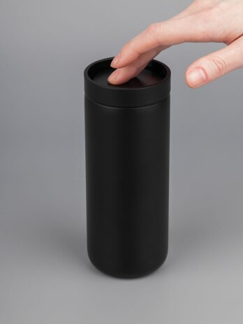 Лаконичный термостакан с удобным клапаном, который открывается и закрывается одним нажатием, — и пить можно с любой стороны.