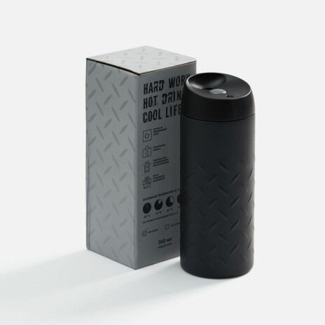 Двухслойная вакуумная конструкция из нержавеющей стали. Герметичная завинчивающаяся крышка с нажимным клапаном для питья. Стакан подходит для большинства автомобильных подстаканников.
