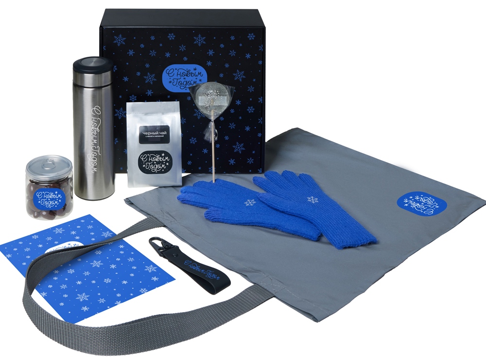 - Подарочный набор с перчатками, термосом и чаем, синий