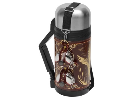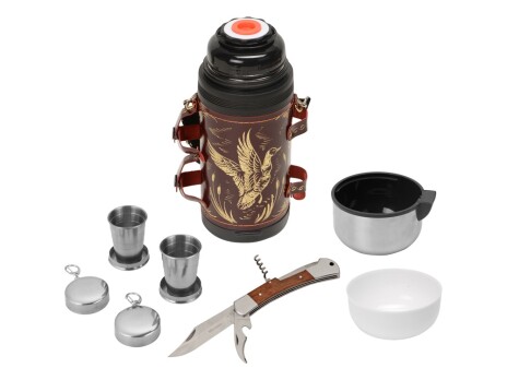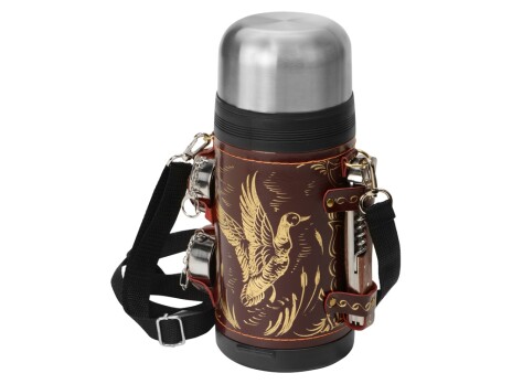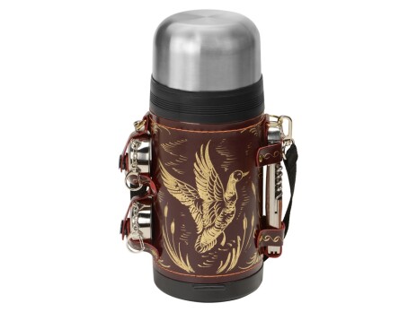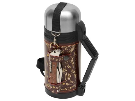 Отличный подарочный термос для дорогого вам человека! Включает в себя термос на 1,2 л в чехле из натуральной кожи с художественным выжиганием, 2 складных стакана и многофункциональный нож. Каждый предмет надёжно закреплён на своём месте кожаными ремешками. Невозможно что-то забыть - пустое место сразу бросится в глаза. В комплекте: - Термос 1,2л (нерж.сталь) с металлической колбой в чехле из натуральной кожи с художественным выжиганием - 1 шт. - Стакан складной 60 мл (нерж.сталь) - 2 шт. - Нож многофункциональный (нерж.сталь) - 1 шт.