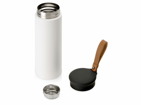 Engage — термос из долговечной нержавеющей стали с двойными стенками, вакуумная изоляция между которыми помогает сохранять температуру напитков в течение долгого времени. Термос идеально подходит для заваривания чая: специально для этого в комплекте идет металлическое ситечко с ручкой, которое не пропустит ни одной чаинки. Термос герметично завинчивается на крышку, оснащенную съемным ремешком из качественной ПУ кожи. Крышка имеет прорезиненное покрытие, что создает интересное сочетание текстур в рамках одной модели. Корпус имеет элегантную рельефную поверхность с антискользящим эффектом. - Удобный ремешок - Герметичная крышка soft-touch - Сохраняет тепло и холод до 18 часов - «Пищевая» долговечная сталь 304 марки - Оптимальный объем