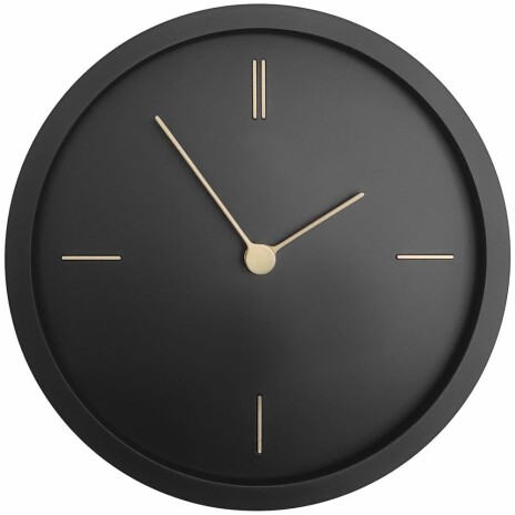 На круглом черном корпусе настенных часов Thelma выигрышно выделяются контрастные золотистые стрелки и тонкие линии часовых меток, создавая строгий и элегантный дизайн.