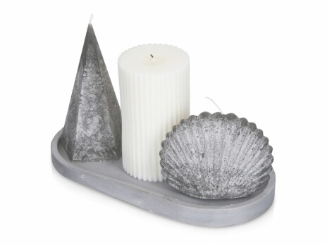 Этот набор из трех ароматических свечей непременно понравится приверженцам минимализма и стилей хай-тек, лофт, эко и скандинавского. Лаконичная геометрия, сочетающаяся с природным дизайном ракушки, натуральные молочный и неоднородный серый оттенки и подставка из гипсобетона смотрятся естественно, стильно и ненавязчиво. Благородный аромат черного перца и кожи, одновременно свежий и терпкий, подарит ощущение комфорта и уверенности. Свечи на 80% изготовлены из натуральных соевого и кокосового воска, не токсичны при горении и не вредны для дыхания. После того как свечи прогорят, подставку можно использовать для пало санто или других благовоний, а также для хранения различных мелочей или ювелирных украшений. - Минималистичный дизайн - Многофункциональная подставка из гипсобетона - Экосостав - Ручная работа