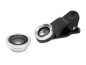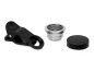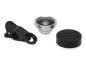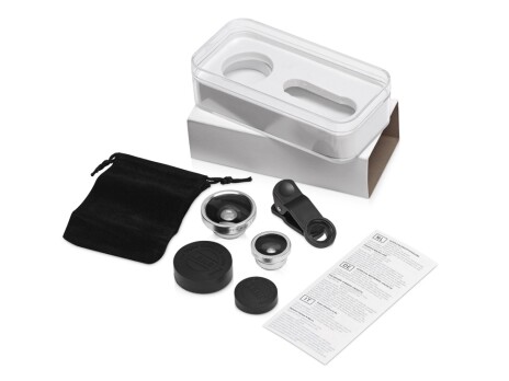 Универсальный набор из 3 линз (объективов) для смартфона. Подходит как для внешних, так и для камер «селфи». В наборе: широкоугольный объектив (0,4 х), объектив «рыбий глаз» (180°) разбирается на 2 части, одна из них - объектив для макросъёмки, зажим-прищепка для крепления объективов, инструкция, пластиковый бокс, защитные крышки для объективов, мягкий чехол.