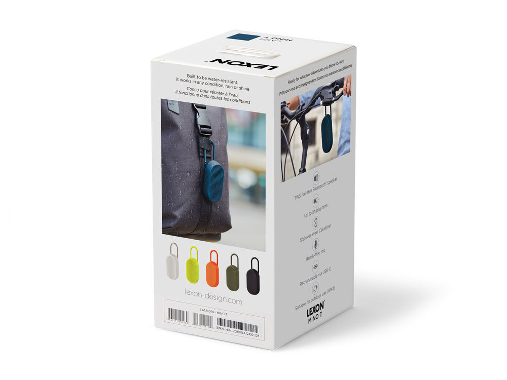 Mino T — это универсальная Bluetooth-колонка, созданная для путешествий. Карабин позволяет легко прикрепить её к сумке или велосипеду. Благодаря элегантному дизайну она гармонично впишется в интерьер, став современным элементом. Оснащённая пассивной басовой системой, Mino T обеспечивает качественное прослушивание, гарантируя сбалансированный и насыщенный звук в дороге. Не беспокойтесь о дожде: сверхпрочное покрытие делает её водонепроницаемой. Наслаждайтесь до 5 часов автономной работы в любых приключениях. Отвечайте на звонки, слушайте музыку или заряжайте колонку через кабель USB-C, установив её на док-станцию. - Bluetooth®-динамик со встроенным карабином - Совместимость с технологией TWS - Водонепроницаемость IPX4 - Микрофон "hands-free" - Пульт дистанционного управления для селфи - Bluetooth® 4.2 - Время работы аккумулятора: 5 ч - Время зарядки: 2 ч - Расстояние Bluetooth®: 10 м - Питание: через порт USB C, кабель в комплекте