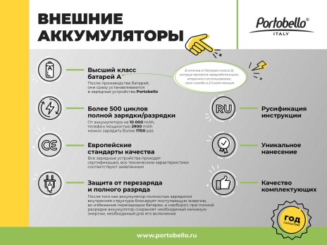 Все внешние аккумуляторы Portobello оснащены NTC-терморезистором, установленным на плату. Он контролирует температуру и при её повышении автоматически снижает напряжение, защищая электронные компоненты от перегрева и избыточной тепловой нагрузки.