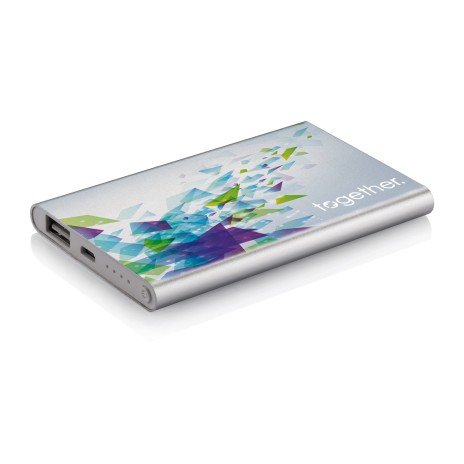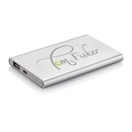 Тонкое зарядное устройство в прочном алюминиевом корпусе со встроенным литий полимерным аккумулятором емкостью 4000 mAh. На корпусе расположена кнопка вкл/выкл и индикаторы уровня заряда. Поставляется в подарочной коробке. Максимальная мощность на выходе 5V/1А, на входе: 5V/800 mAh. В комплекте кабель micro-USB.