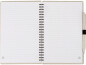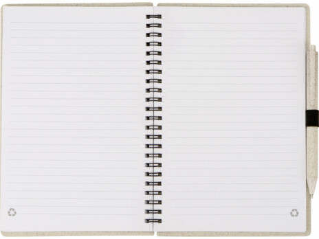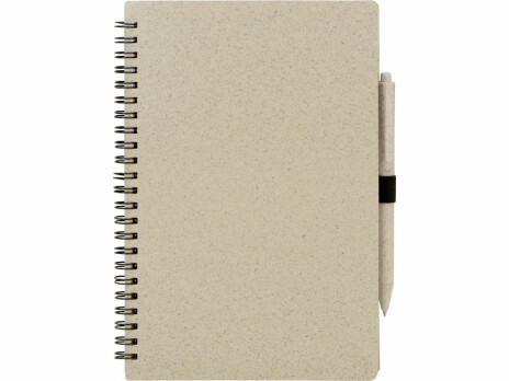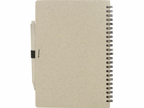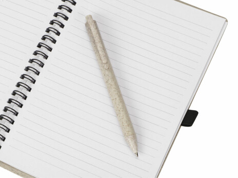Блокнот с обложкой из переработанной пшеницы и пластика. Блок состоит из 80 листов переработанной бумаги белого цвета. Крепление - пружина. В комплекте шариковая ручка в тон блокноту из пшеничной соломы.
