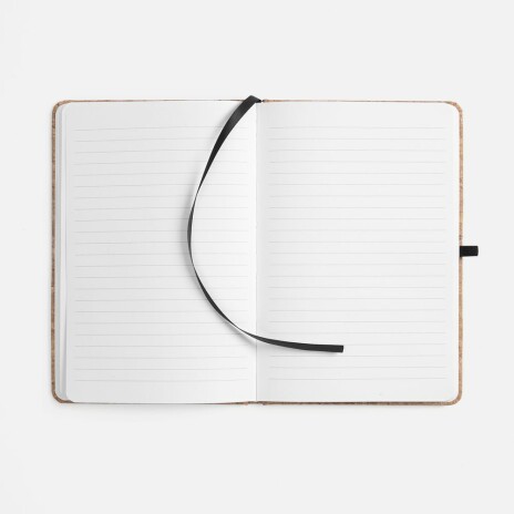 Блокнот в твердой обложке из натуральной неокрашенной пробки, дополнен цветными петлей-резинкой для ручки, ляссе и резинкой на обложку.