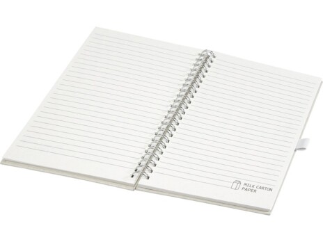 Блокнот на спирали формата A5 для заметок с 70 линованными листами плотностью 80 г/м², изготовленный из переработанных картонных коробок из-под молока (до 70%). Картонные коробки из-под молока собираются, сортируются, перерабатываются и превращаются в бумагу, таким образом действительно превращая мусор во что-то полезное.