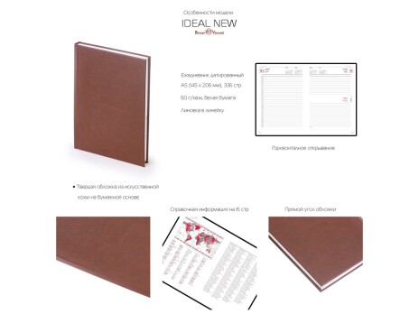 Датированный ежедневник «IDEAL NEW». Блок содержит 336 страниц белой бумаги плотностью 60 г/кв.м. Обложка - классический итальянский переплетный материал на бумажной основе ,устойчивый к истиранию. Справочная информация на 16 страницах.