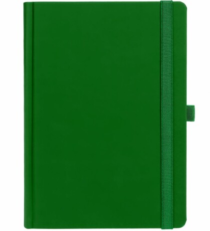 Ежедневник с твердой обложкой без поролона, выполнен из материала Soft Touch Ultra, зеленый FF, дополнен резинкой шириной 1 см, петлей-резинкой для ручки, капталом и ляссе ярко-зеленого цвета.