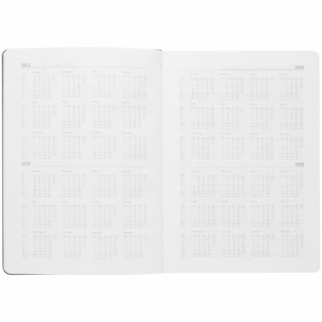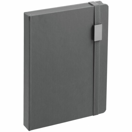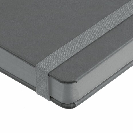Ежедневник с твердой обложкой, выполнен из материала Latte, серый СС, обрез серого цвета, дополнен ляссе серого цвета и резинкой с металлическим шильдом.