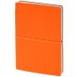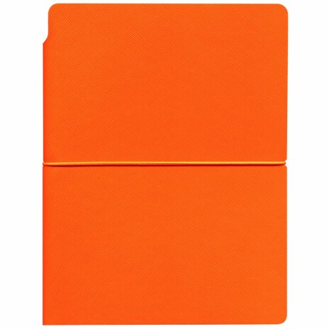 Ежедневник с гибкой обложкой выполнена из материала Nice Touch, оранжевый и Latte, оранжевый (внутренняя часть обложки), дополнен горизонтальной резинкой в цвет обложки. Внутри корешка — специальное место для крепления ручки размером до 15х1 см.