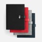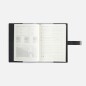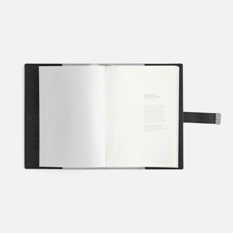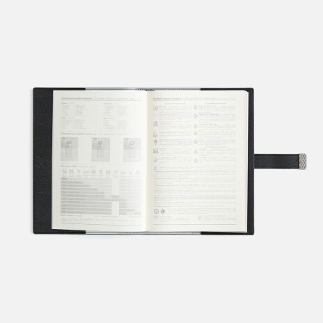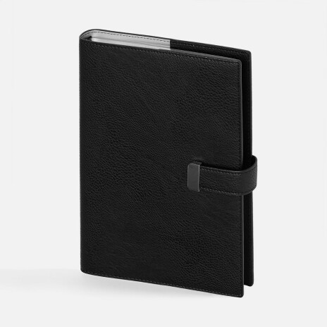 Ежедневник в мягком переплете со съемной обложкой, дополнен застежкой-хлястиком с металлическим шильдом на кнопке, двойным ляссе и капталом.