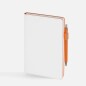Гибкая обложка, материал обложки — Soft Touch, белый BB и Latte, оранжевый ОО; материал петли для ручки — Nice Touch, оранжевый ОО. Срез обложки окрашен в оранжевый цвет.