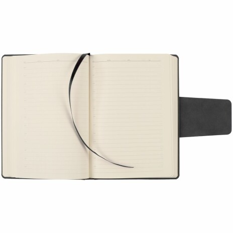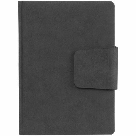 Ежедневник с твердой обложкой c поролоном, выполнен из материала Nubuck, темно-серый ЕЕ, дополнен капталом и ляссе черного цвета. Застежка — магнитный хлястик.