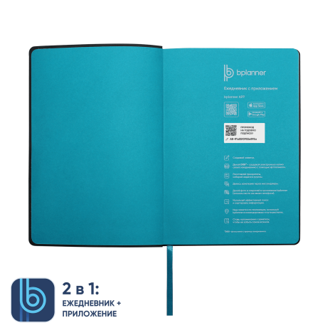 Bplanner 01 изготовлен в широкой цветовой линейке из экокожи в фактуре софт-тач. У ежедневника гибкая обложка, цветной форзац и нахзац и ляссе в цвет обложки. Модель характеризуется широкой цветовой линейкой. Ежедневник подходит для УФ-печати и тиснения логотипа компании. На форзаце ежедневника расположен qr-код, который активирует годовой доступ к мобильному приложению Bplanner.