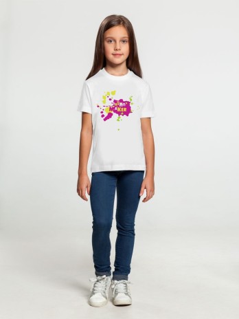 Классическая футболка с боковыми швами (4 года) или без боковых швов (с 6 лет), с укрепляющей тесьмой по вороту. Край ворота в резинку с эластаном. Двойная прострочка по низу, на рукавах и на вороте спереди.