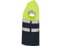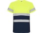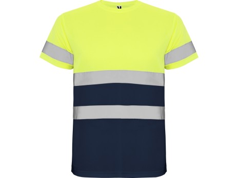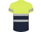 Футболка со светоотражающими элементами с короткими рукавами. Круглая горловина из той же ткани, с усиленными закрытыми швами на внутренней стороне горловины. Две горизонтальные светоотражающие полосы на туловище и одна светоотражающая полоса на рукавах.