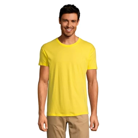 Это базовая, комфортная и недорогая классическая футболка без боковых швов из мягкого хлопкового полотна. Мягкость достигается за счет тонкой, но прочной пряжи, имеющей ровную безворсовую структуру. Круглый ворот из рибаны с эластаном. Укрепляющая тесьма по вороту.Втачной рукав.Прямой силуэт.Широкая цветовая гамма, наличие парных женских и детских моделей. Цвет близкий к PANTONE Process Yellow C