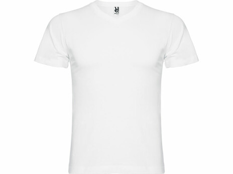 Мужская футболка без боковых швов с коротким рукавом и V-образным вырезом горловины, отделанном рибом 1х1. Горловина и плечевые швы дополнительно укреплены тесьмой.