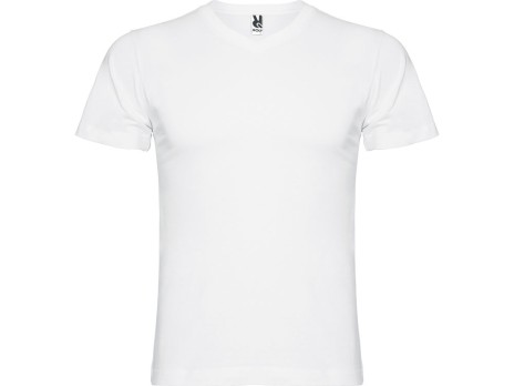 Мужская футболка без боковых швов с коротким рукавом и V-образным вырезом горловины, отделанном рибом 1х1. Горловина и плечевые швы дополнительно укреплены тесьмой.