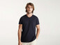 Мужская футболка без боковых швов с коротким рукавом и V-образным вырезом горловины, отделанном рибом 1х1. Горловина и плечевые швы дополнительно укреплены тесьмой.